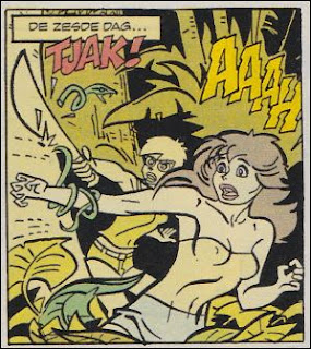 Een sprongetje naar pagina 28. Franka wordt opnieuw aangevallen door een dino. Opnieuw kantje boord als ze hem met een tak weet af te leiden.